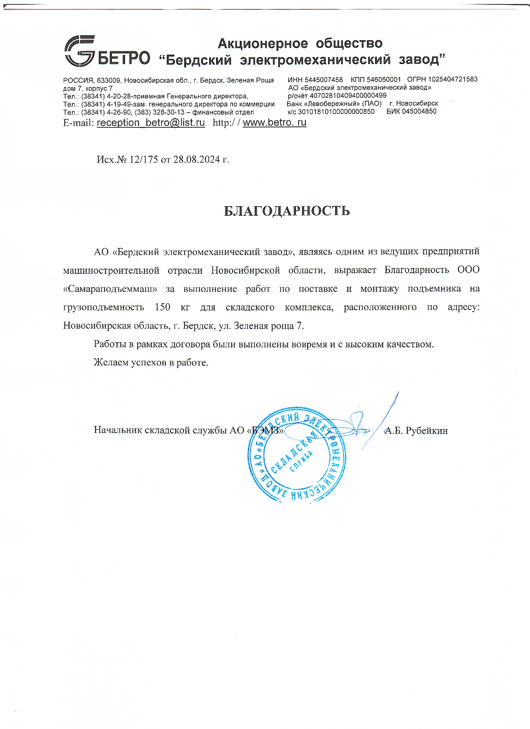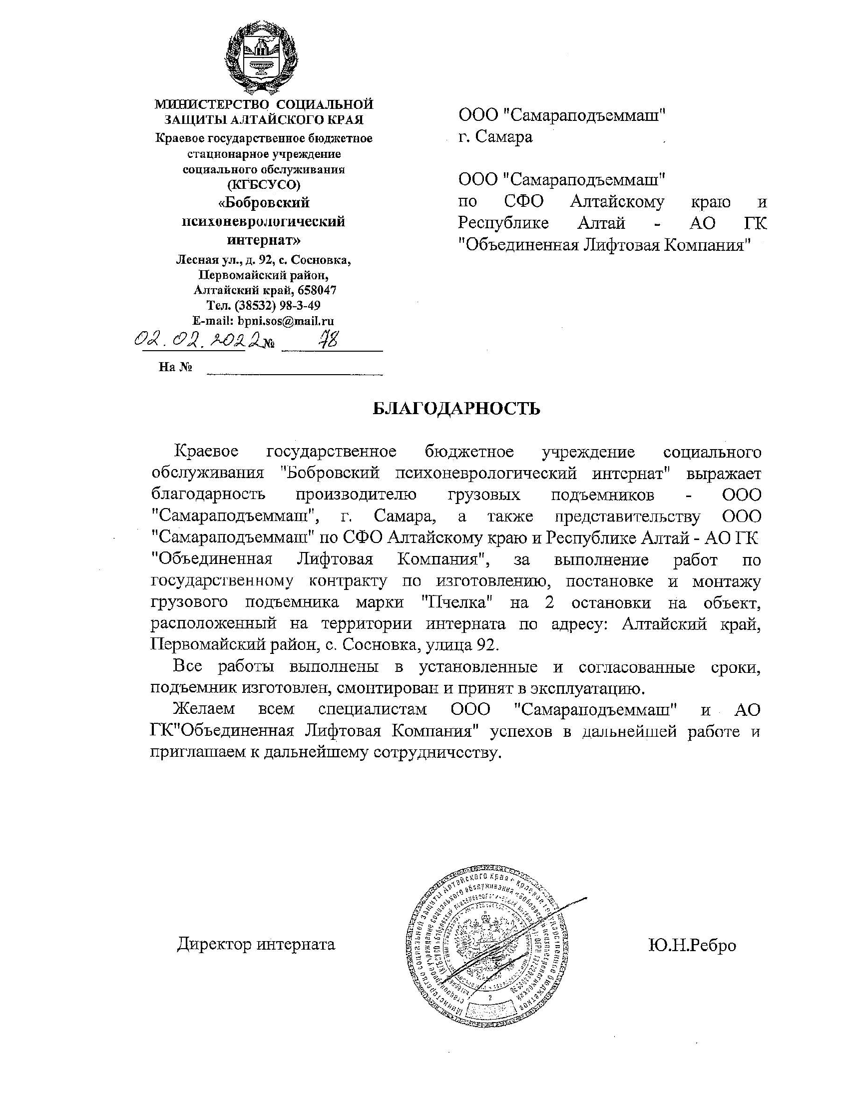 Краевое государственное бюджетное учреждение социального обслуживания "Бобровский психоневрологический интернат"выражает благодарность производителю грузовых подъемников - ООО "СПМ", г. Самара, а также представительству ООО "СПМ" по СФО Алтайскому краю и Республике Алтай -