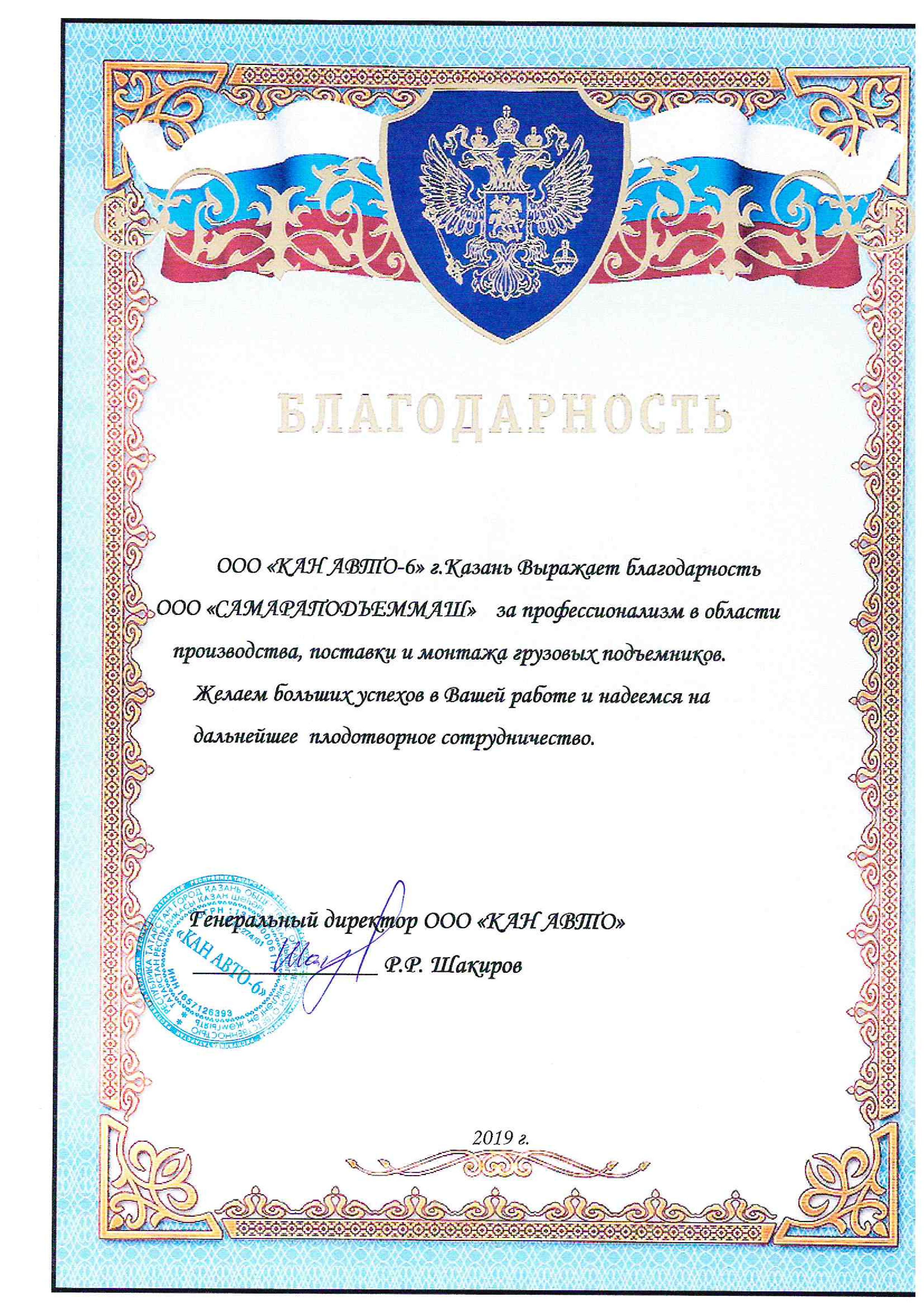 ООО "Кан Авто-6" г. Казань выражает благодарность ООО "СПМ" за профессионализм в области производства, поставки и монтажа грузовых подъемников. Желаем больших успехов в Вашей работе и надеемся на дальнейшее плодотворное сотрудничество.