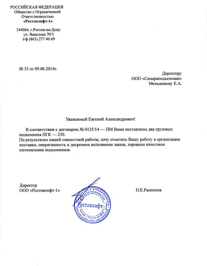 Директор ООО «Ростовлифт-1» Распопов Н.Е.