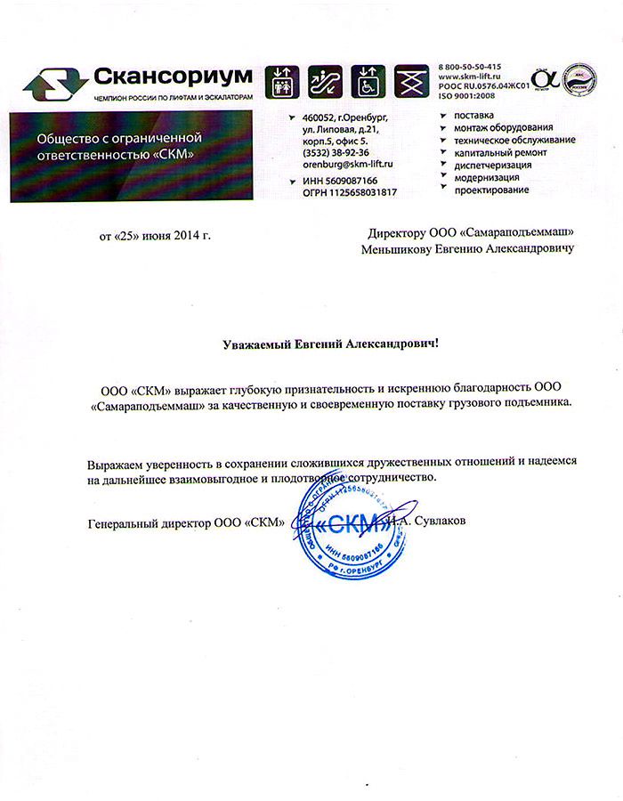 ООО «СКМ» выражает глубокую признательность и искреннюю благодарность ООО «СПМ» за качественную и своевременную поставку грузового подъемника.