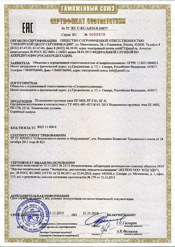 Посмотреть все сертификаты на наши подъемники.